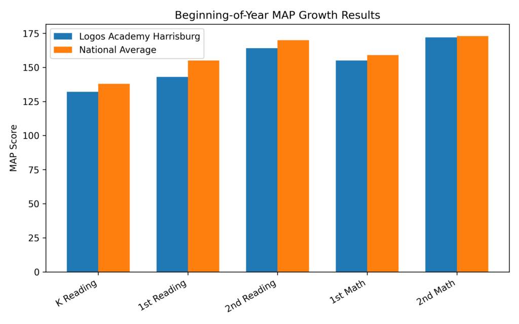 At Logos Academy Harrisburg, we use a standardized assessment designed to measure academic growth and achievement called the MAP Growth test.  We administer this test 3 times a year to understand where students are starting, measure progress over time, and tailor instruction and supports to meet individual needs. These assessments are paired with ongoing formal and informal classroom evaluations, giving our teachers a well-rounded picture of student learning and growth.