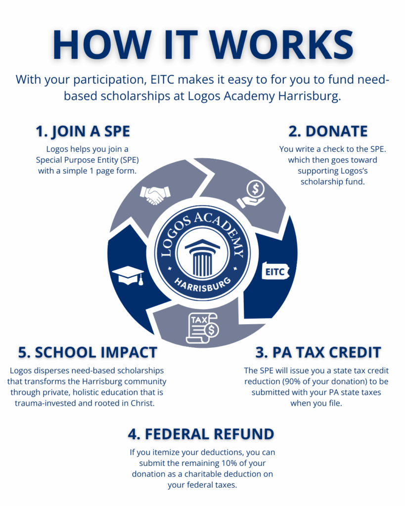 The Pennsylvania Educational Improvement Tax Credit (EITC) program allows individuals and businesses to redirect a portion of their state tax liability to support schools like Logos Academy Harrisburg. Participants receive up to a 90% state tax credit in return.